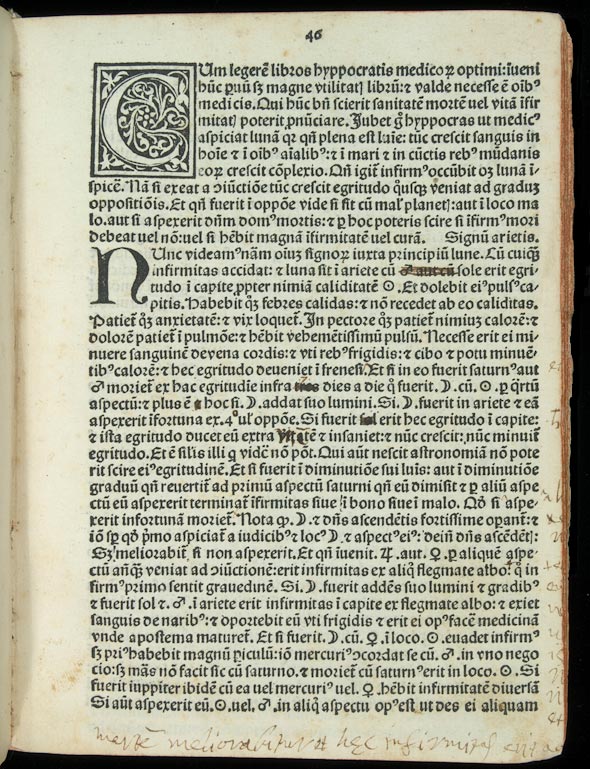 This edition also includes a brief scientific treatise entitled Hyppocratis libellus de medicorum astrologia, which follows Bellavalle's work. Essentially, this tract deals with the incidence and course of diseases and their treatment, including the proximity of death, according to the phases of the moon in the twelve signs of the zodiac. The De medicorum astrologia was known under the name of Hippocrates (Astrologia Ypocratis) throughout the Middle Ages, even though there is no evidence indicating that such a treatise had been attributed to Hippocrates of Cos in antiquity. Likely, this later attribution is due to the fact that the famous physician had expressed his belief in the impact of metereological changes and of the position of the stars on disease and health in his work De aeribus, aquis et locis, which scholars have accepted as authentic. It is possible that the De medicorum astrologia was actually derived from an early Greek or Byzantine source, which was similar to the work on which Galen based his own treatise on lunar prognostications in medicine. From the thirteenth century onwards, the De medicorum astrologia won the attention from several scholars, such as Petrus de Abano (1257-ca. 1315), professor and physician at the Universities of Paris and Padua, who is credited with the translation from Greek into Latin, which is the one included in this 1485 edition (Kibre, 94-6; 105).