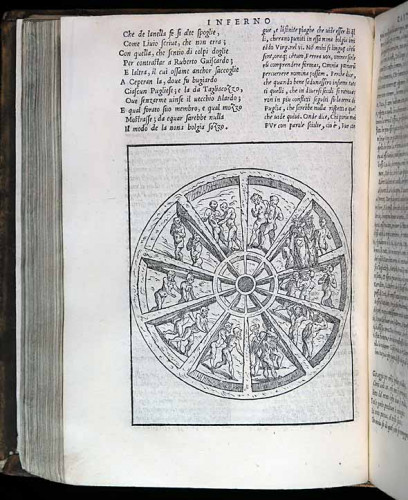 This volume is profusely illustrated with 87 woodcuts, including two repetitions. Three of the woodcuts are full-page illustrations, establishing the beginning of the Inferno, the Purgatorio and the Paradiso. The first ten blocks illustrate Alessandro Vellutello's introduction, which mostly deals with the structure of Dante's Hell. The other illustrations generally depict the cantos as in the fifteenth-century Venetian edition that dictated later representations of the poem: Comento di Christophoro Landino fiorentino sopra la Comedia di Danthe Alighieri poeta fiorentino (Venice: Bernardino Benali & Matthio da Parma, 1491). However, Marcolini's artist departs from the previous iconographic tradition by incorporating woodcuts that illustrate the commentaries themselves.