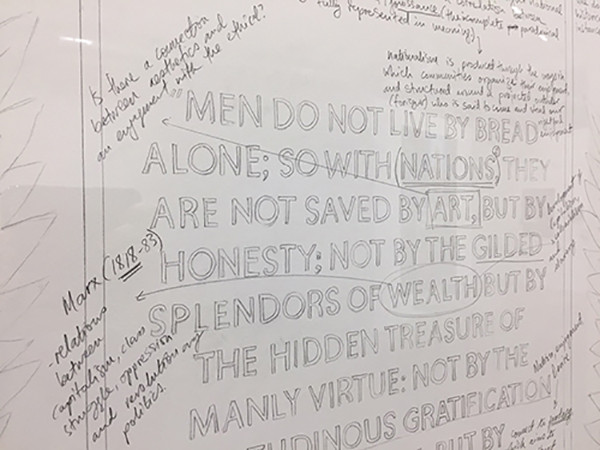 The artist has used a text- and research-based drawing practice to engage deeply with Douglass and how his life and words have been memorialized. Mokgosi has redrawn the four monument panels that appear on the Douglass statue plinth, and in his own hand, layering on probing questions and thoughtful comments. Each annotated drawing contains footnotes, expanded Douglass quotes, and additional biographical details that offer a new, deeper reading.